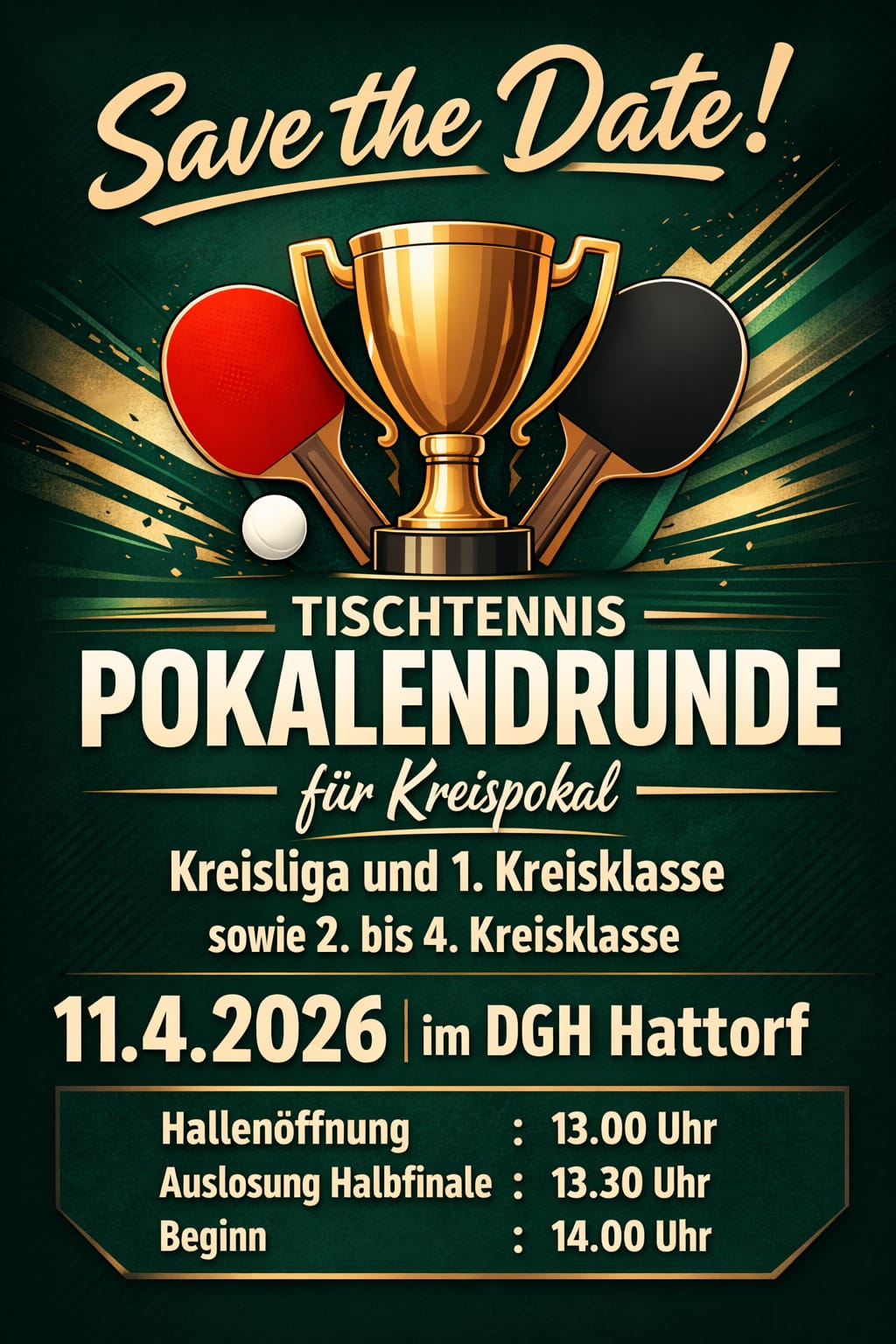 Was für eine grün-weiße Saison: Nach der Meisterschaft der IV. Herren hat auch die II. Herren dieses Kunststück in der 1. Kreisklasse vollbracht!! Ein Unentschieden der III. Herren in der gleichen Liga gegen den ärgsten Titelkonkurrenten hat dazu beigetragen, dass der II. Herren Platz 1 nicht mehr zu nehmen ist - HERZLICHEN GLÜCKWUNSCH!!! Und es kommt noch besser: Sowohl die II. und die III. Herren als auch die IV. Herren haben sich für ihre jeweiligen Kreispokalendrunden qualifiziert - die II. & III. Herren im Wettbewerb der Kreisliga / 1. Kreisklasse und die IV. Herren in der Konkurrenz der 2. & 3. Kreisklasse! Dieser jeweilige Halbfinaleinzug der angesprochenen Teams ist ein toller Erfolg für den TTC, der dieses Mal sogar die beiden Endrunden ausrichtet - Halbfinale dahoam, sozusagen. Und zwar am Samstag, den 11.04.2026 - die Halle öffnet um 13:00 Uhr, die Auslosung der Halbfinale erfolgt um 13:30 Uhr, und um 14:00 Uhr geht's dann los. Wir wünschen allen Teilnehmenden viel Spaß & Erfolg, für's leibliche Wohl wird gesorgt sein!