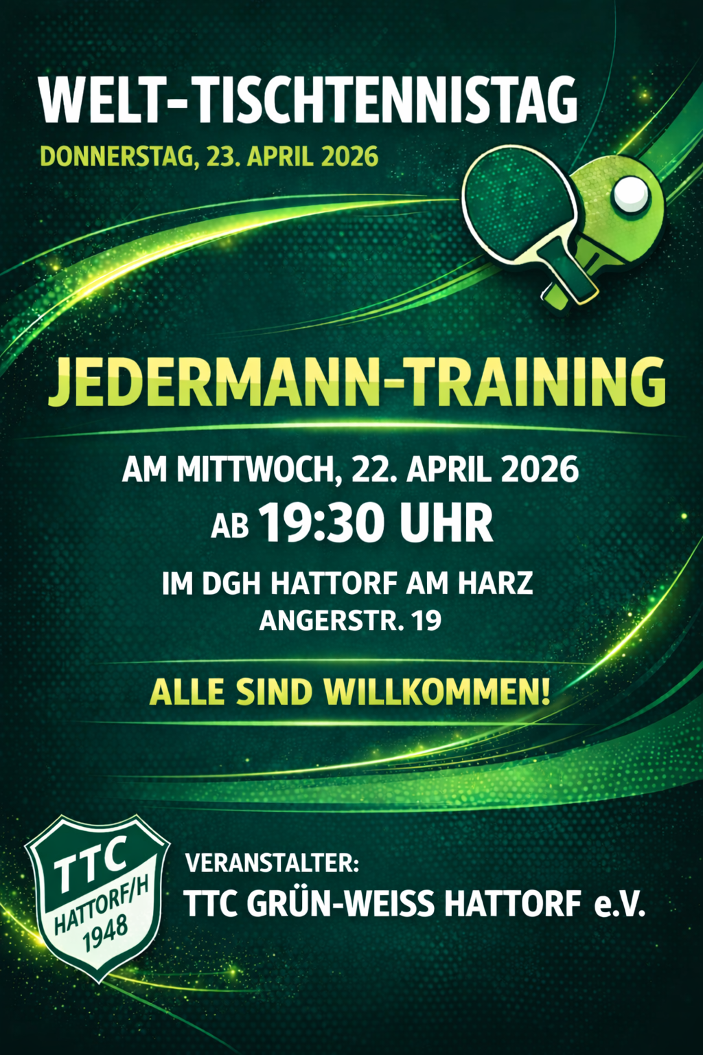 Schön, dass Ihr vorbei schaut. Der TTC Grün-Weiß Hattorf ist mittlerweile seit mehr als 75 Jahren am Start - wenn Ihr Lust habt, dabei zu sein oder mal rein zu schnuppern, Tischtennis zu erlernen, aufzufrischen oder einfach mit etwas Bewegung Eure Freizeit zu verbringen:
